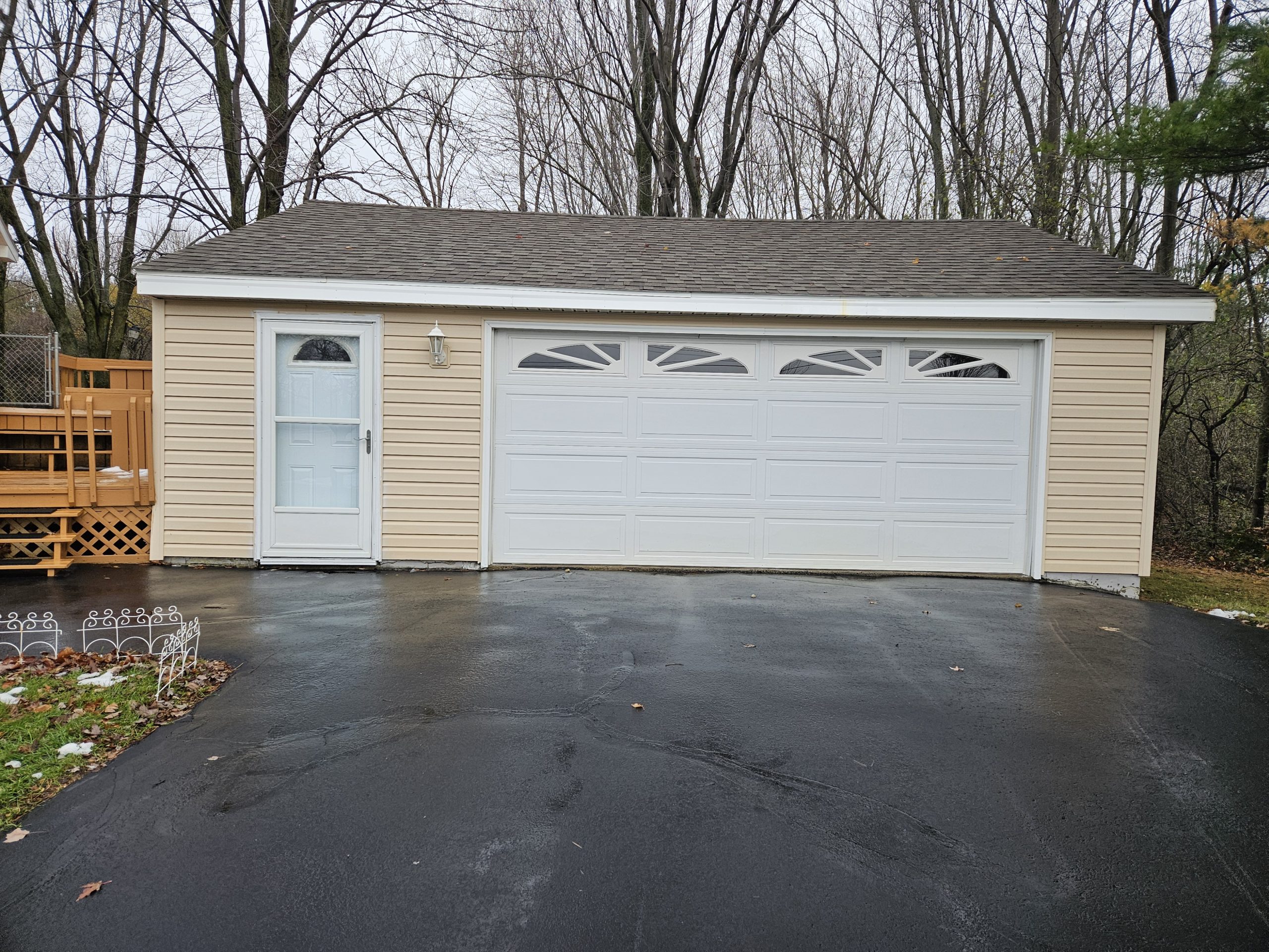 Outdoor amenities are equally impressive, including a 24′ x 28′ detached garage and a two-tier deck (approx. 360 sq. ft.) that conveniently connects the garage to the house. The property also features a large fenced-in area of roughly 100′ x 200′, perfect for dogs or outdoor activities. Additional highlights include two apple trees, a large driveway, and a large 8′ W x 12′ L x 10′ H storage building for tools, equipment, or recreational items.